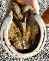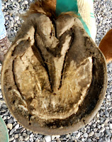 Again a long stretched toe, you can see the stretched white line (picture above), the heels are too far forward, look at the heel and then look at the back of the frog, the heel bulbs are sticking out, also notice one is bigger than the other. The next photo is the same hoof three trims later. Again, only trimming hoof wall and bars, balancing the heels, rolling the hoof wall and not removing live sole. This horse is starting to develop a calloused sole and instead of being flat its starting to have concavity, the contracted forward heels have come back to where they should be aligning with the heel bulbs. There is more happening inside that we can't see, the changes on the outside show us the inside is realigning for correct bone alignment and a correct balanced, functional hoof.